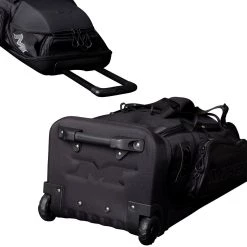 The all-new Miken Pro Wheeled Bag features a large bat compartment, a telescoping handle, Wide set tank wheels with full EVA base for the ultimate support and durability, a vented shoe compartment, extra-large main compartment, and 2 smaller compartments, molded top converts to a shelf, removable decoration panel for customization, easy-grip handles, clear ID window, and durable “J” style hook.Dimensions: 37”L X 12”W x 14”H