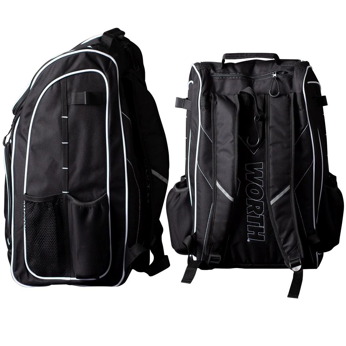 The all new Worth Backpack features: 2 elasticized neoprene bat sleeves, a durable “J” style fence hook, a mesh zippered pocket inside top compartment, and a front storage compartment.Dimensions: 13”W X 10”D x 21”H