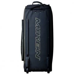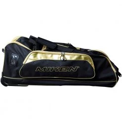 Limited Edition Miken Championship Roller Bag – Black/Gold Dimensions: 37”x15”x14” Individual bat compartments hold 4 batsTelescoping handleWide set tank wheels with full bottom rails and extra base support for strength, balance and durability Vented shoe compartmentExtra large main compartment with optional interior dividers for organization4 side pockets for small storageClear ID PocketRemovable decoration panel for customization. Easy grip handles to load bag in and out of vehicle